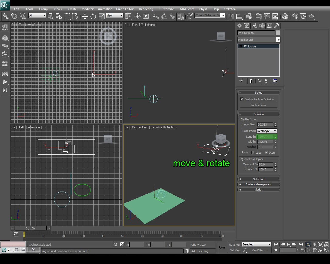 Step 10: Back in the Perspective Viewport move the PF Source 01 and rotate it similar with the image below, and change it's length to about 110.